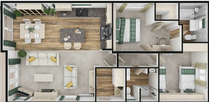 At 40ft x 20ft this spacious lodge has two bedrooms, main bedroom with king size lift up storage bed, dressing room and en-suite bathroom with bath, over head shower, toilet & sink. Large twin bedroom with full sized single beds, spare luxury blow up bed and family bathroom with large walk in shower.