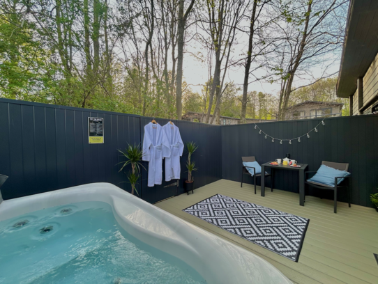 Open plan living, dining, kitchen area with large patio doors leading to an enclosed and secluded court yard area with hot tub.