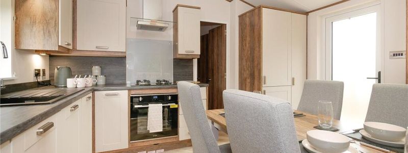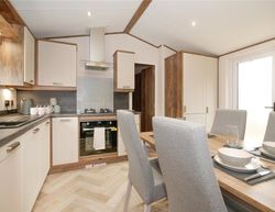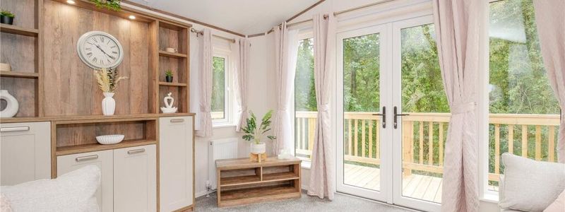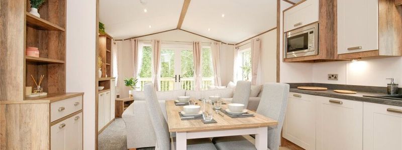 This beautifully maintained, pre-owned two-bedroom, two-bathroom lodge offers refined lakeside living, complete with a private en-suite to the master. Situated on a sought-after lakefront plot, it features expansive wraparound decking and a private fishing pontoon—perfect for tranquil outdoor enjoyment. The lodge comes fully furnished to a high standard and is in excellent condition throughout. Elegant French doors open into a spacious open-plan living area, blending comfort and style with seamless indoor-outdoor flow.