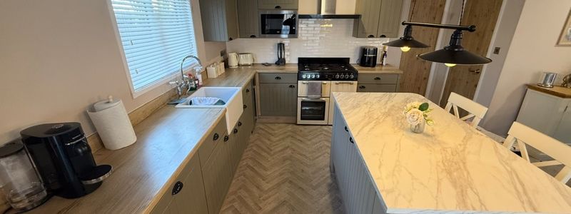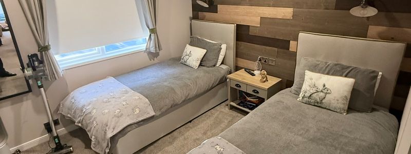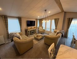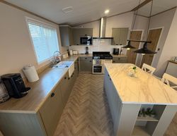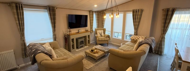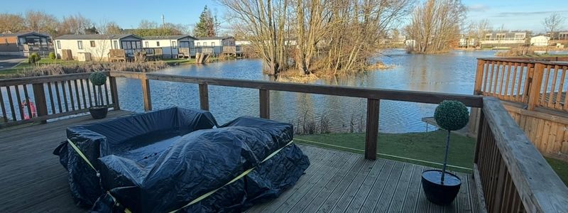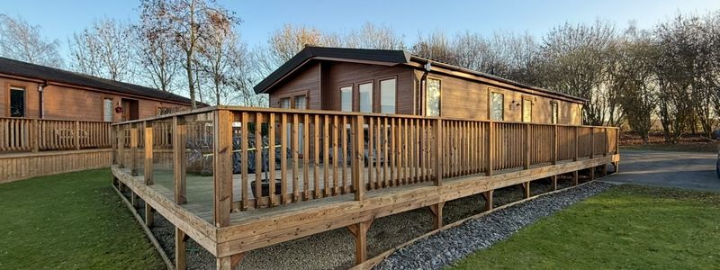 This beautifully maintained, pre-owned two-bedroom, two-bathroom lodge offers refined lakeside living, complete with a private en-suite to the master. Situated on a sought-after lakefront plot, it features expansive wraparound decking and a private fishing pontoon—perfect for tranquil outdoor enjoyment. The lodge comes fully furnished to a high standard and is in excellent condition throughout. Elegant French doors open into a spacious open-plan living area, blending comfort and style with seamless indoor-outdoor flow.