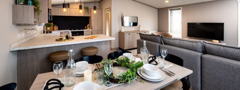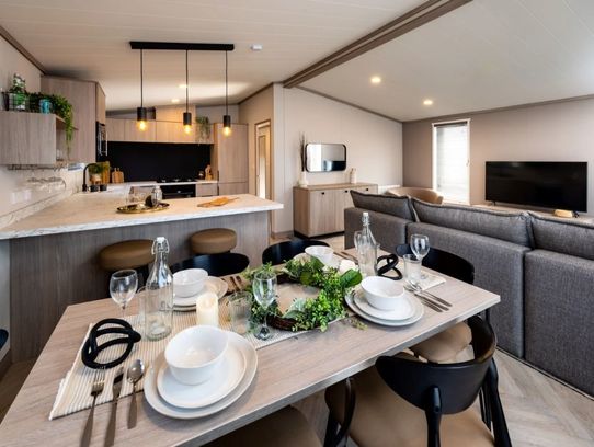 A lovely and spacious plot with a brand new Victory Faraday twin lodge recently sited. Residential spec, 40 x 20ft offering 2 bedrooms, master en-suite, open plan living and fully fitted kitchen, utilty-boot room. This lodge wlll have a large, composite decking which extends and enhances the living area.