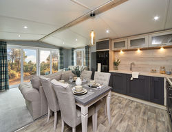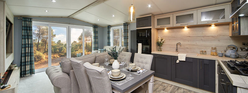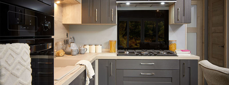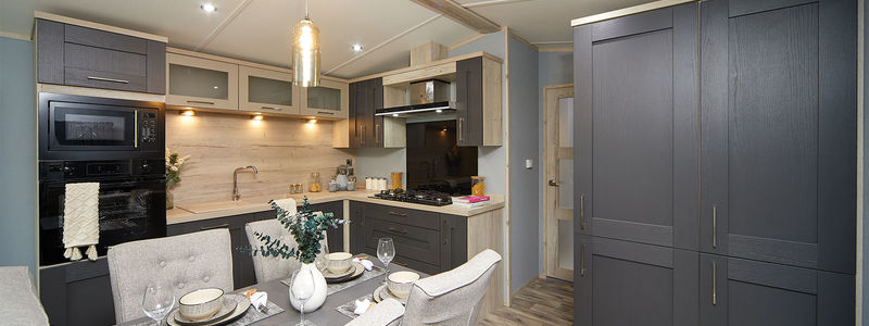 Meal times are a breeze in the Whinfell's well equipped kitchen, featuring a gas hob with overhead extractor, fan oven and microwave all surrounded by light oak timber accents and warm grey fronted doors. Guests are kept comfortable with button backed, cushioned dining chairs.