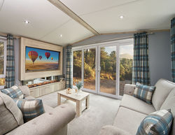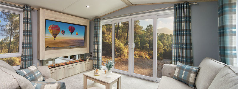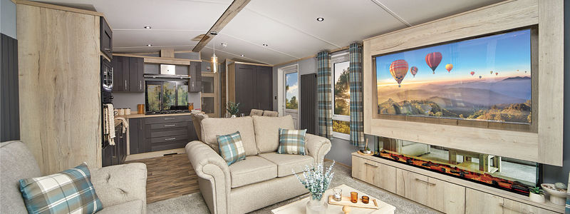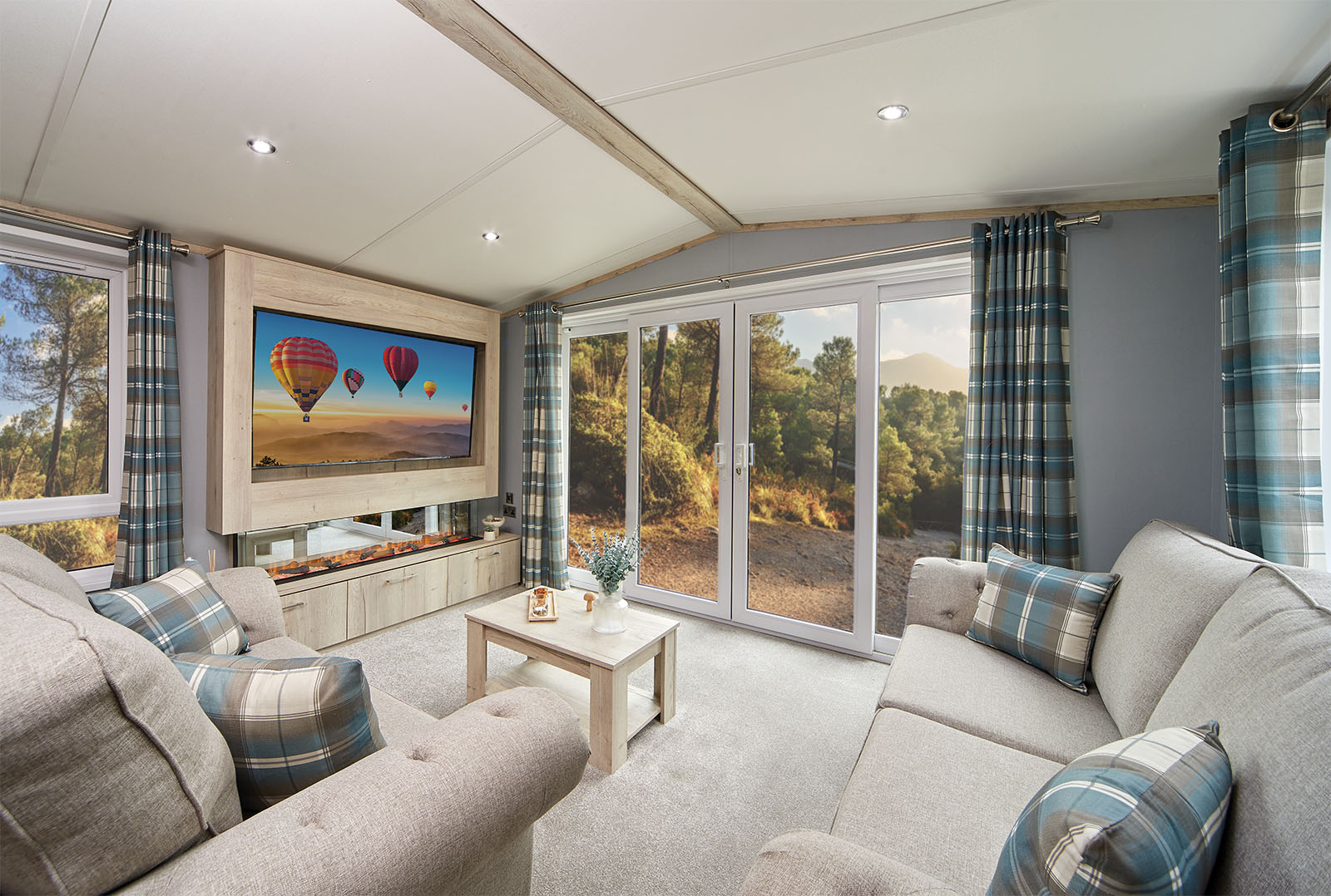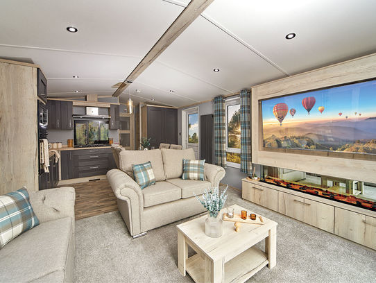 Patio doors open into the spacious open plan lounge, inviting you to unwind in deep, comfortable sofas. The centrepiece of the room is a feature wall with panoramic flame-effect fireplace, perfect for relaxation and warmth, creating a cosy ambiance that feels like home.
