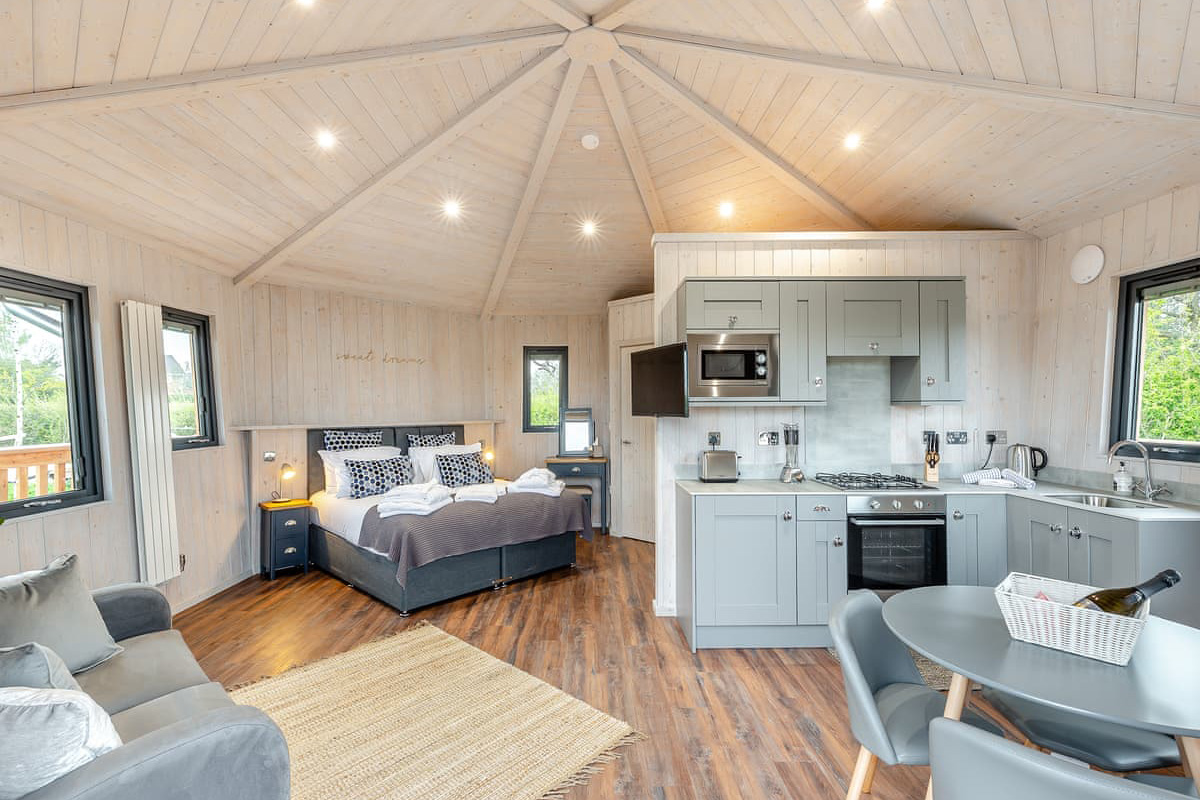 Each holiday home is individually handcrafted with an octagonal design that feels both modern and cosy. Inside, you will find a king-size bed, a well-equipped kitchen, and a stylish bathroom. The open-plan layout creates a comfortable living space, while thoughtful touches add to the overall sense of ease.