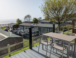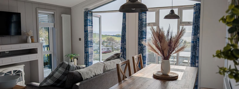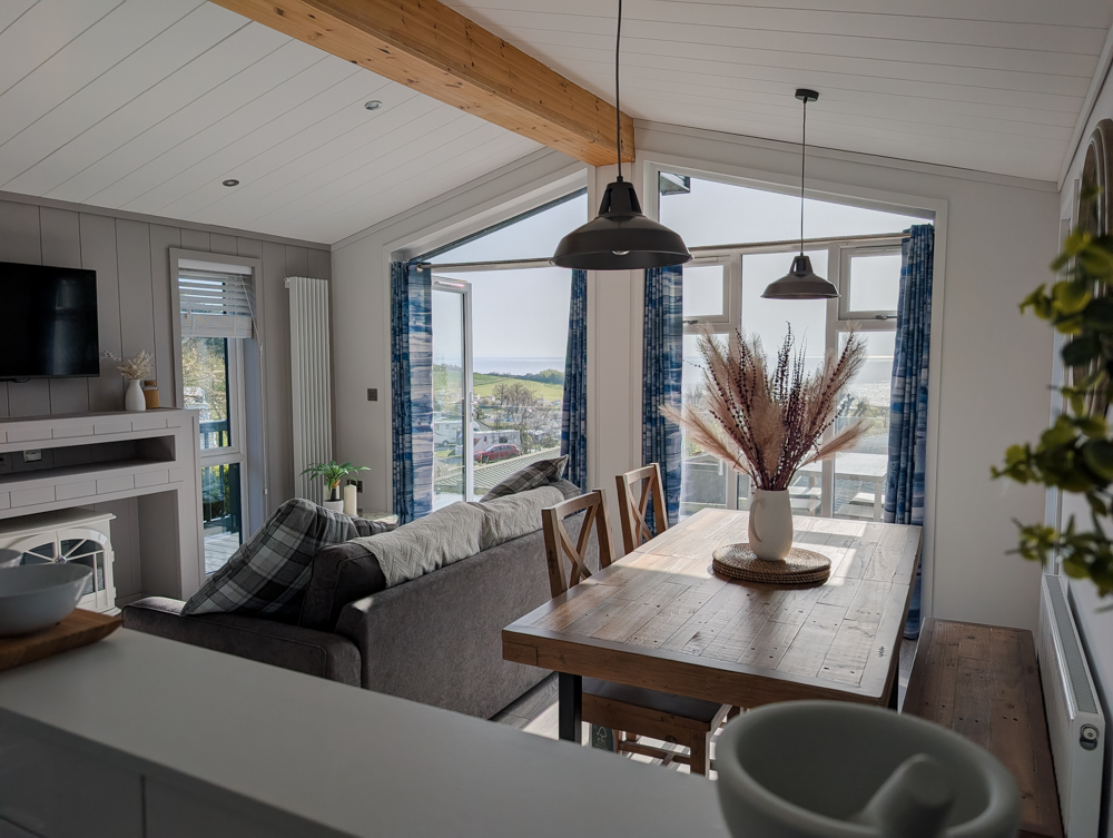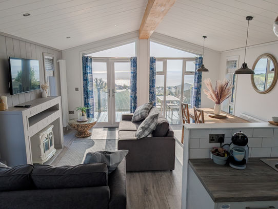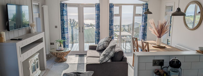 The bright, open living area features two comfortable sofas and a cream electric wood-burning stove set on a sandstone hearth. Large windows fill the space with light and frame stunning sea views.