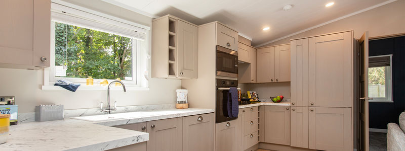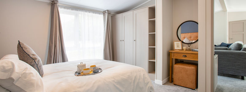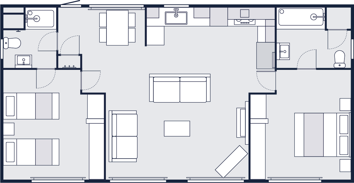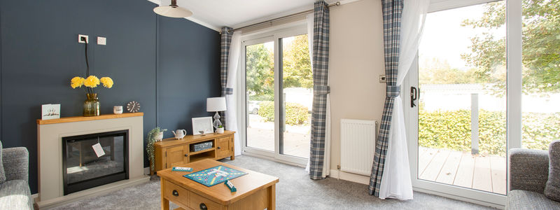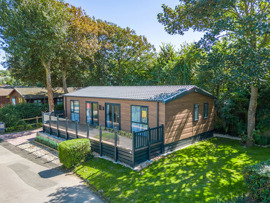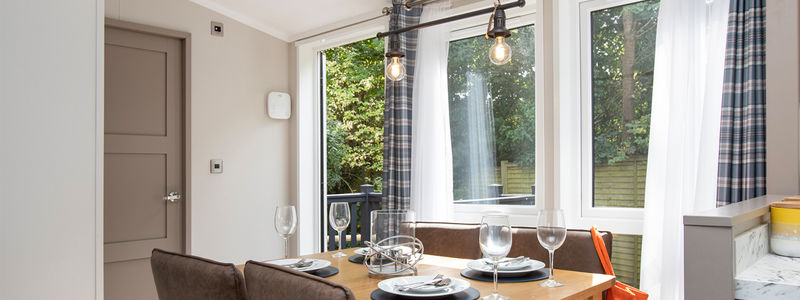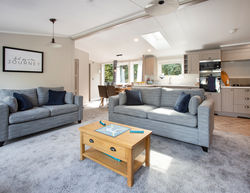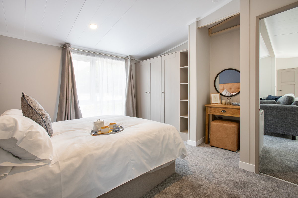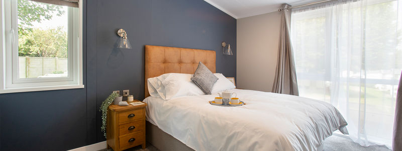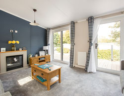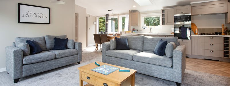 This centre-lounge Lodge has been designed to be spacious and modern, with a calming and cohesive colour scheme throughout. The open-plan kitchen/dining/living area is sociable during the day, while offering additional privacy at night, with the two bedrooms at opposite ends of the Lodge.