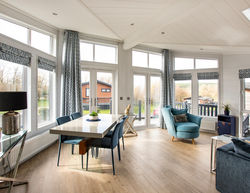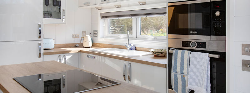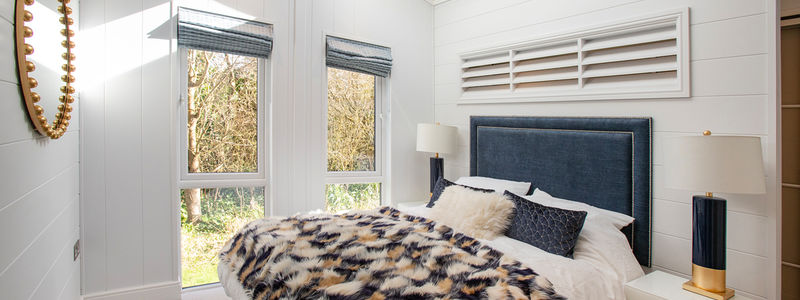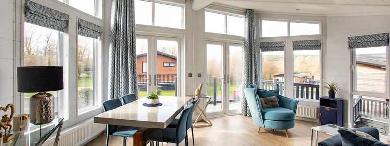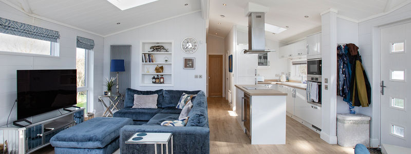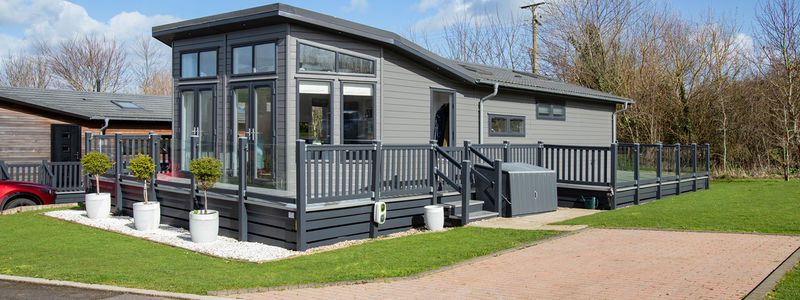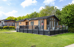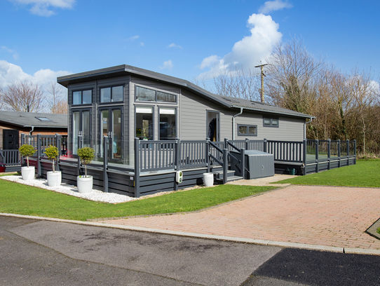 This prestige Glass House lodge sits on Jurassic Retreat, a small and exclusive luxury lodge development at Larkfield. The pitch comes with a large decking and is surrounded by plenty of grass space.