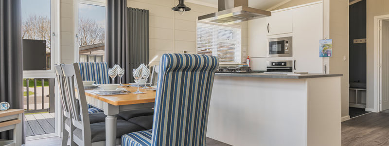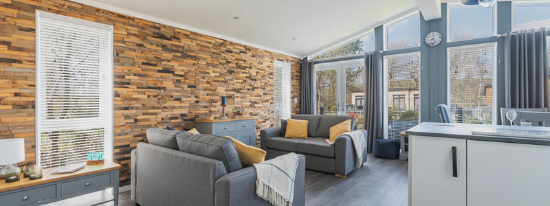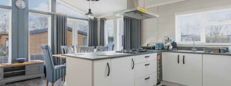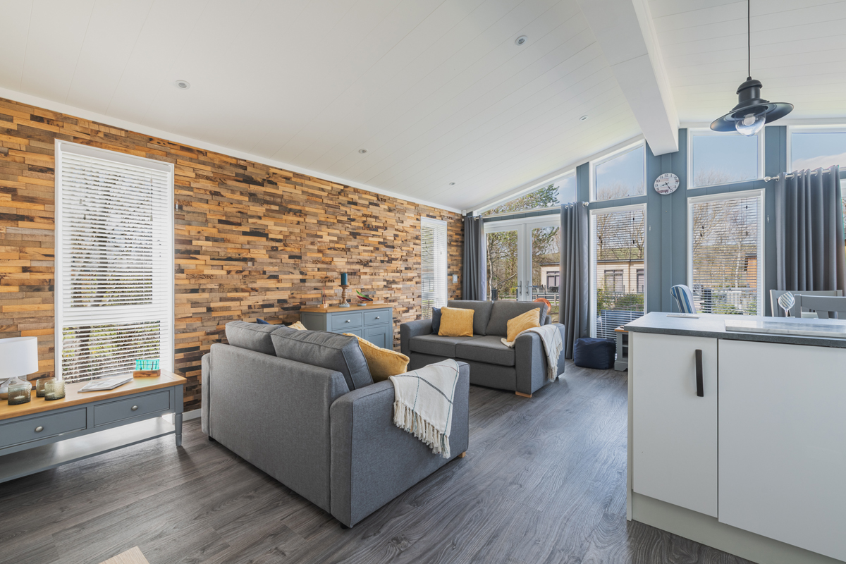Two sets of patio doors leading onto the large decking let lots of natural light into the main living area, a warm and sociable space with a good-sized and fully-equipped kitchen.