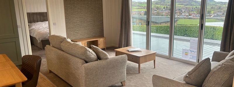 This is a stunning Centre Lounge Aspire Lodge, nestled in the heart of wales, on a small, family run park with only 10 extremely high end lodges. Gates entrance, views spanning miles across gorgeous farmland. Private Garden, 2 bedroom, 2 bathroom, huge patio doors leading to your private decking finished with clear glass throughout, private parking for 2 cars.