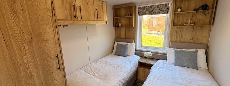 Master bedroom with king-size bed, walk in wardrobe, fitted wardrobe complemented by an en-suite shower, WC and basin. Twin bedroom offers generous over-bed storage and a fitted wardrobe for added convenience.