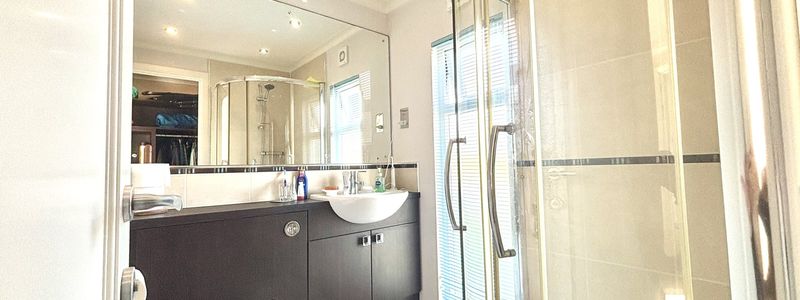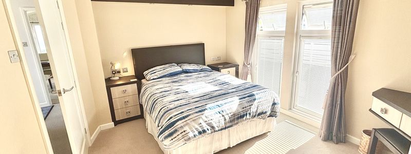 The luxurious master bedroom features a king-size bed, a generous walk-in wardrobe, and a private en-suite shower room. The second bedroom includes a comfortable single bed – perfect for guests or younger family members – and is served by a stylish family bathroom. A single Z-bed is stored in the utility room, which also contains a washer/drier.