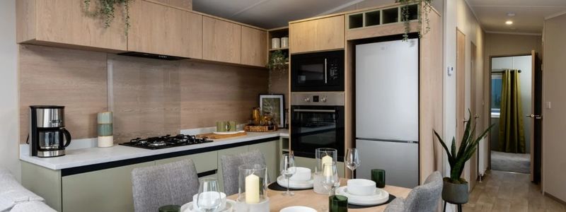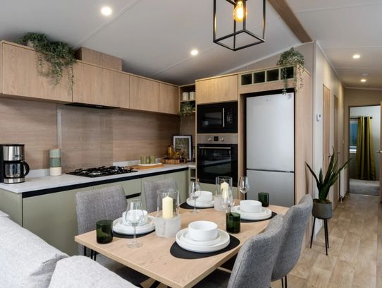 Located within the popular Overstone Lakes Holiday Park, this beautifully presented 40ft x 14ft two bedroom Victory Arlington offers a stylish and welcoming retreat. The spacious open-plan kitchen, dining and living area is designed for modern living, featuring integrated kitchen appliances seamlessly built into the contemporary layout. Warm wood tones throughout add character and create cosy, homely atmosphere.