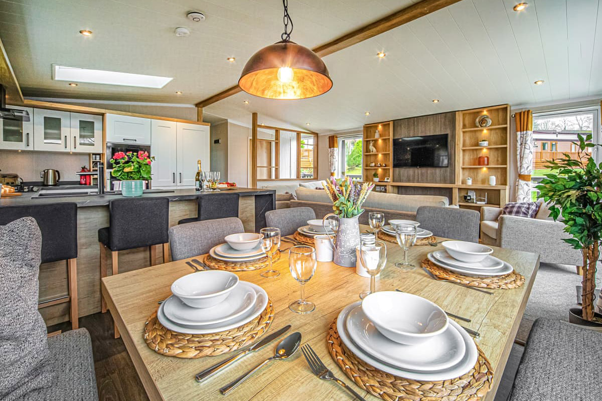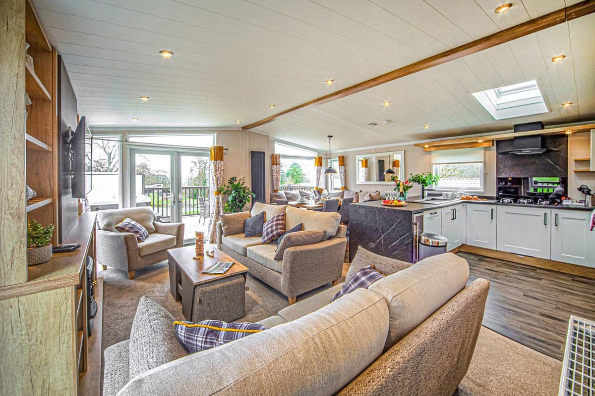 Guests can choose from a range of lodges, holiday homes, and even a spacious manor house, all designed with comfort in mind. Interiors feature open-plan living spaces, well-equipped kitchens, and outdoor decking, with many options including private hot tubs for relaxing evenings. Heating, linen, and essential amenities are all included for an easy stay.