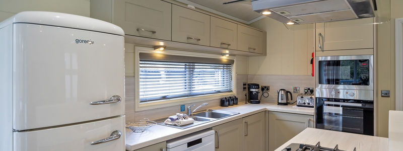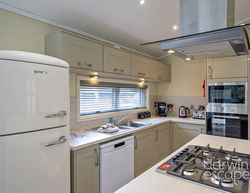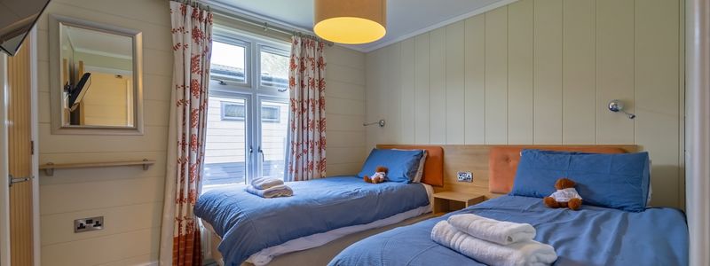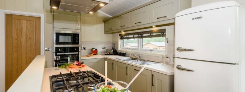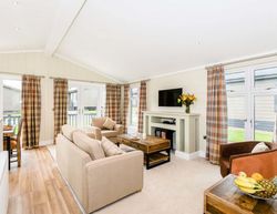 The lodge includes two bedrooms, two bathrooms, a fitted kitchen with appliances, double glazing with central heating, full decking, and a private parking space.