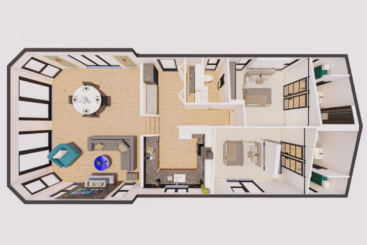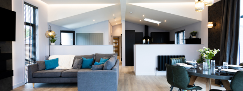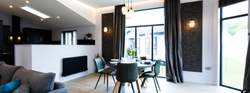 Built to BS3632 standards, the High View is a split-level lodge blending style with sophistication. Its glazed frontage and split-roof design maximise views, while the oak-finished interior flows through a modern kitchen, elevated lounge, and versatile bedrooms. With a dressing area, utility space, and striking exterior, this lodge offers effortless luxury and a true haven for holidays or retreats.